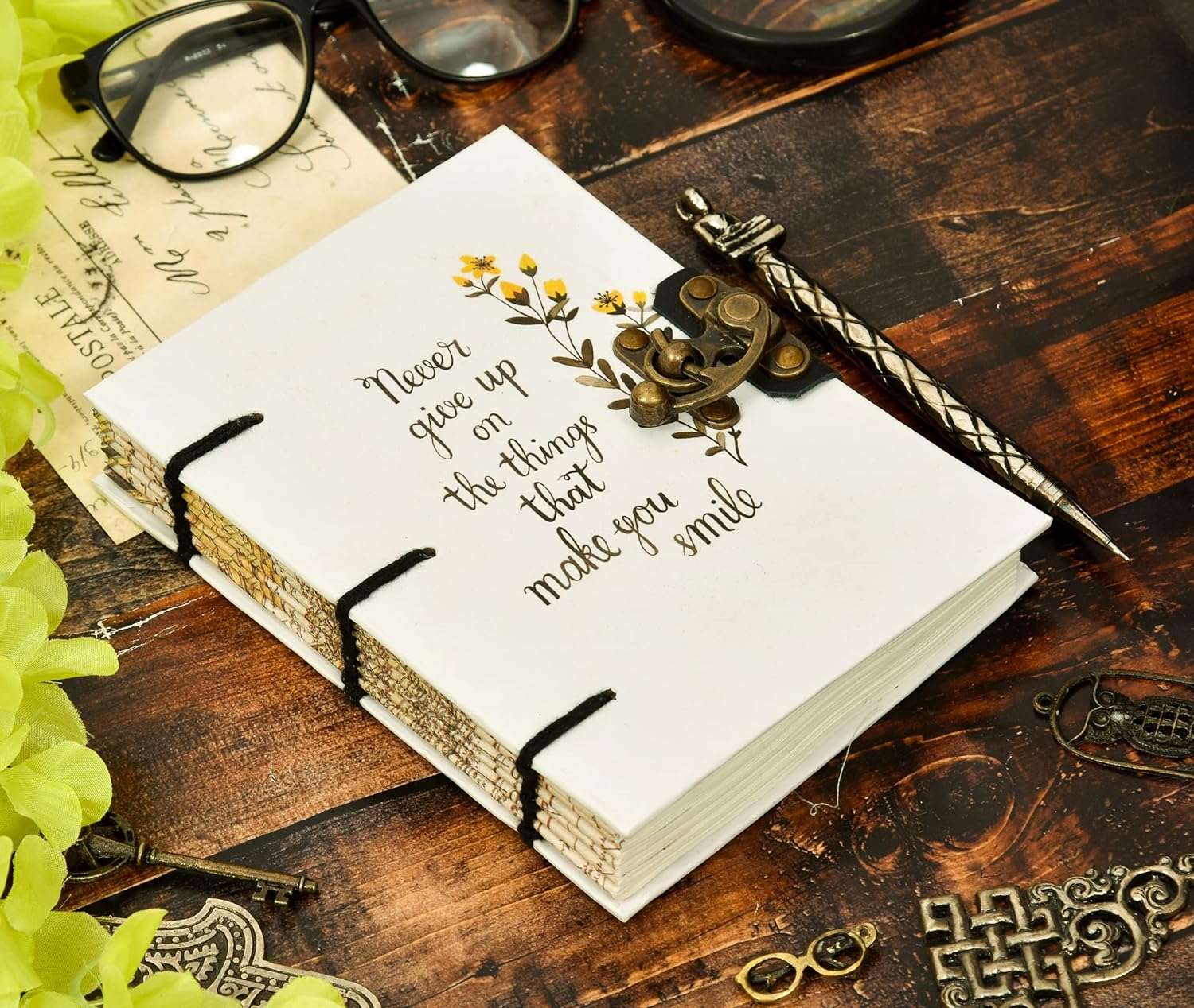 vintage handmade leather journal. Crafted with genuine leather, it radiates authenticity and charm, perfect for those who appreciate classic craftsmanship. The premium antique lock closure adds a touch of elegance and security, ensuring your thoughts and memories are safeguarded within its pages. Inside, you’ll discover 200 brown handmade pages, providing ample space for your musings, sketches, and stories to unfold. Whether it’s for journaling, sketching, or planning, this versatile journal is a timeless companion for your creative endeavors. Treat yourself or a loved one to this exquisite piece, a celebration of tradition and creativity